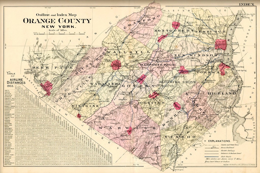 Orange County’s central regions, encompassing the towns of Wawayanda, Wallkill, Goshen, Chester, Blooming Grove, Hamptonburgh, and Warwick, are well-known for their agricultural activity. Grasses in these low-lying regions tended to produce the richest quality of milk compared to mountain pastures. Additionally, nearby mountain ranges form what some may call protective borders. The southeastern edge is bordered by the Schunnemunk, Warwick, Bellvale, and Ramapo ranges while the northwestern border is defined by the Shawangunks. The central low-lying region, known in the southern reaches of the county as the Drowned Lands, extends northward to the towns of Blooming Grove and New Windsor. The region gets its name from the three-mile-thick glaciers that, even after thousands of years of melting, left large lakes and expansive swamps. Here, the fertile plain ends just north of Blooming Grove and becomes more mountainous. This can also be said of the northern region where the Shawangunks give the towns of Montgomery and Crawford a more elevated terrain. In the county’s southeastern and western regions, two prominent mountain ranges of Orange County with elevations reaching over 1,000 feet in some areas. In the southeastern region, the Ramapo Mountains extend north from the New Jersey Highlands to the Hudson River just south of Newburgh. It is in this range where the Highlands slice the land in a series of diagonal striations, creating numerous valleys known as cloves such as Smith’s Clove in the town of Woodbury. Here, within the valleys, the towns of Cornwall, Woodbury, Monroe, Arden, and Tuxedo are found. Likewise, to the west, New Jersey’s Kittatinny Mountain becomes the Shawangunk Range in Orange County where the city of Port Jervis is practically separated from the rest of the area. This obstacle, however, did not hinder the city from being an industrial and transportation hub.