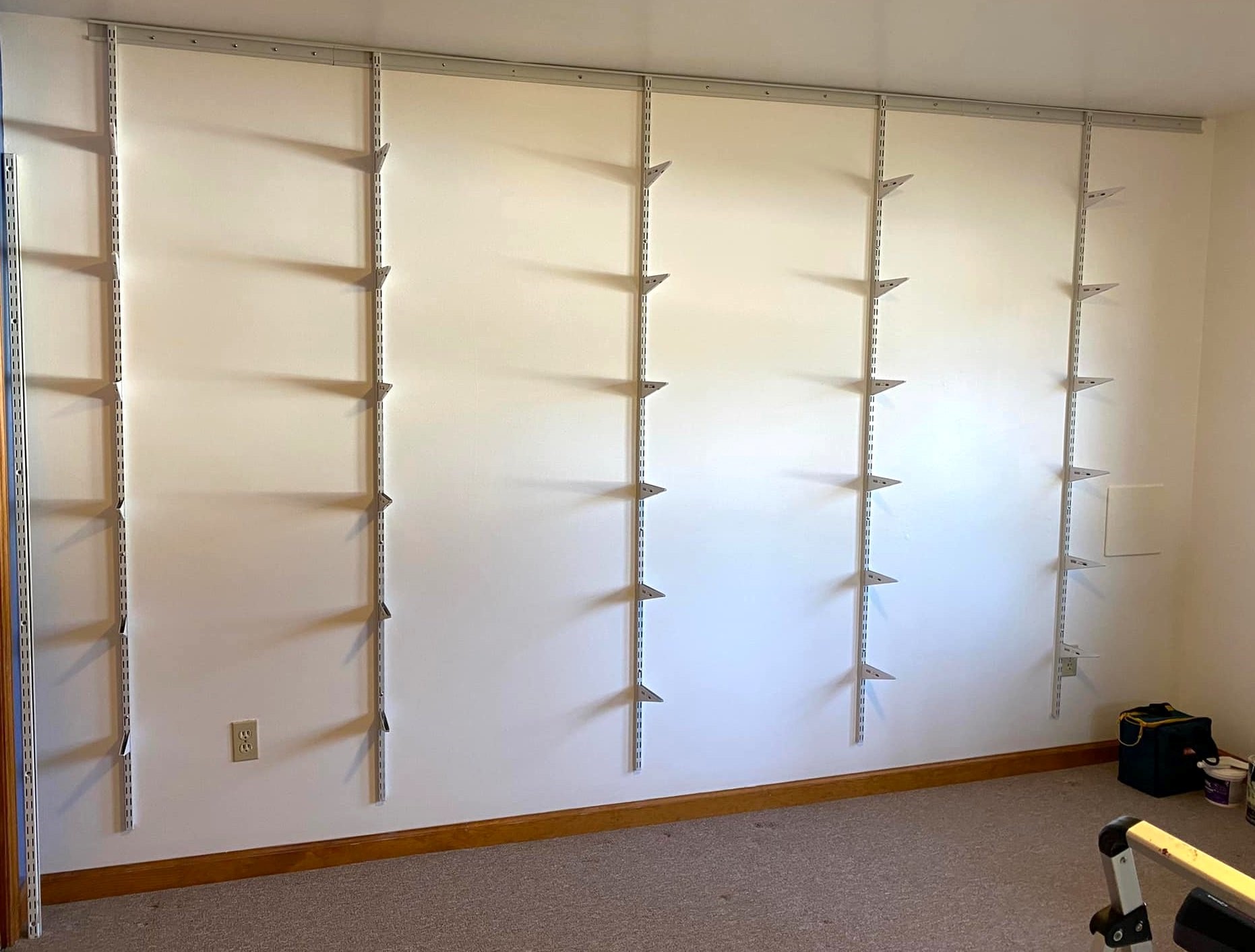 Construction of the museum’s phase A began in early March 2022, began with wall painting and the instillation of shelf bracketry. The five shelf standards are affixed into wooden studs behind the wall and additionally supported by a bracket running near the ceiling.