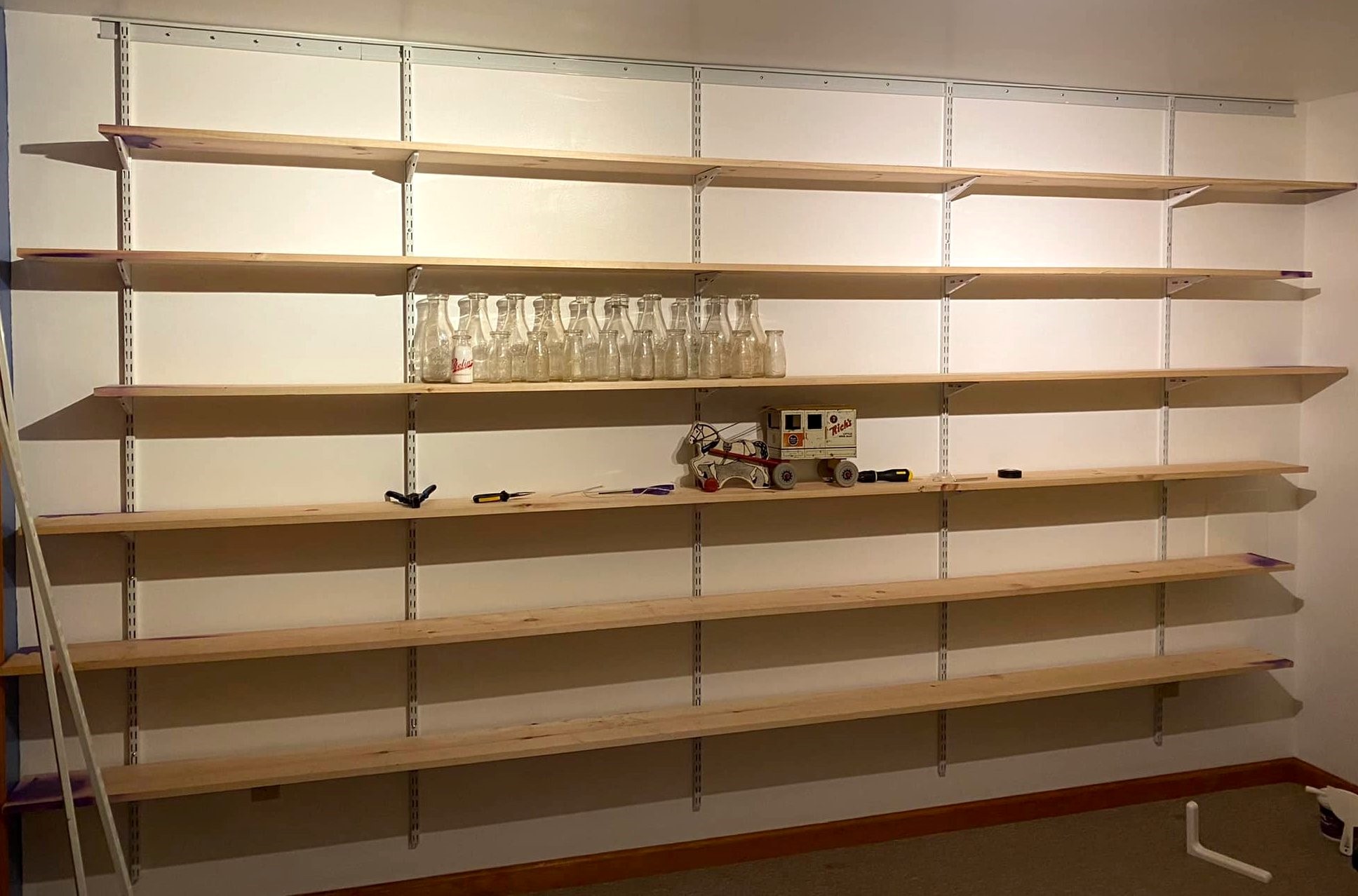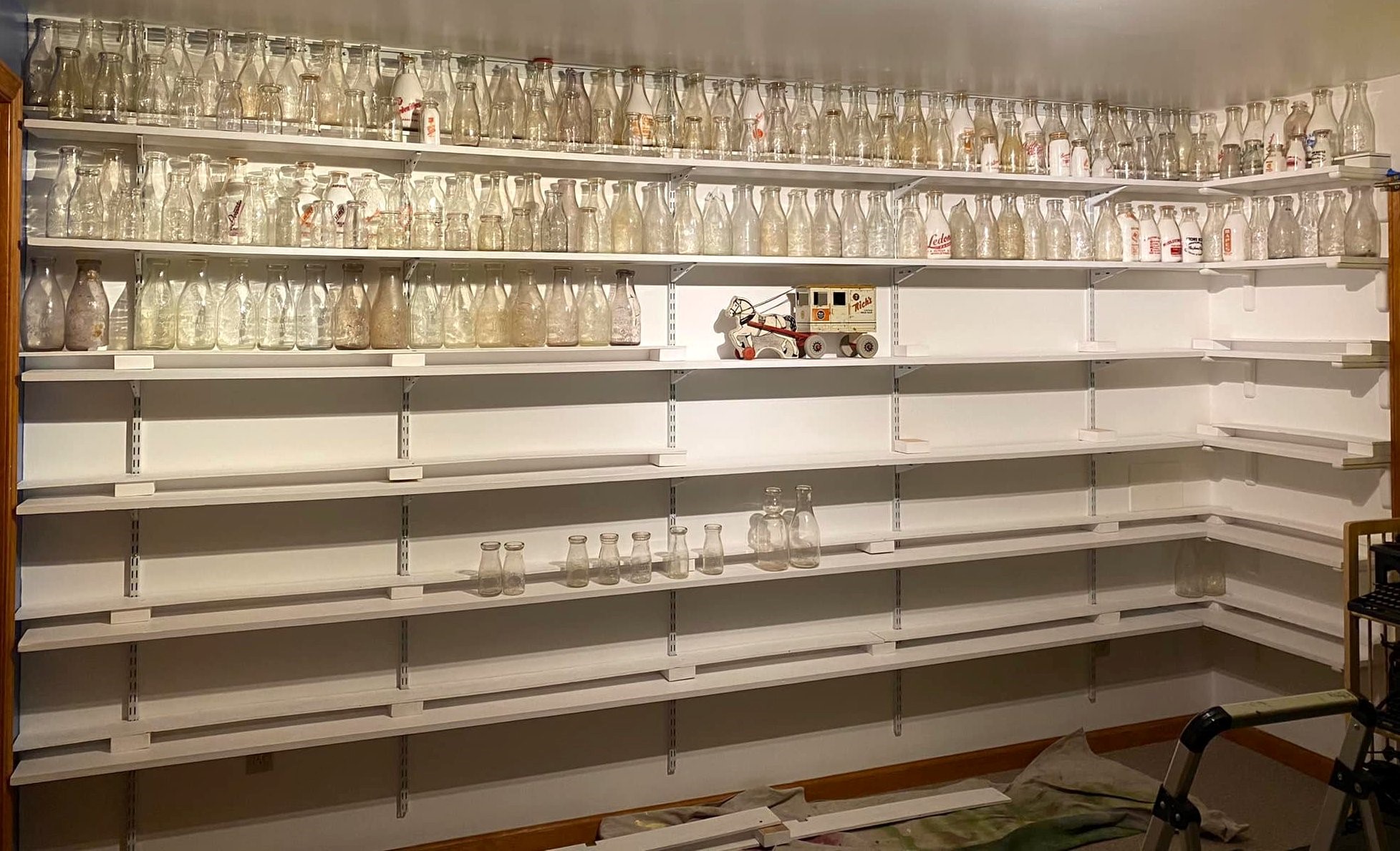 In late March 2022, shelves were test fitted on the brackets. The toy milk wagon was once in the collection of Toni Knipp of who this museum is dedicated.