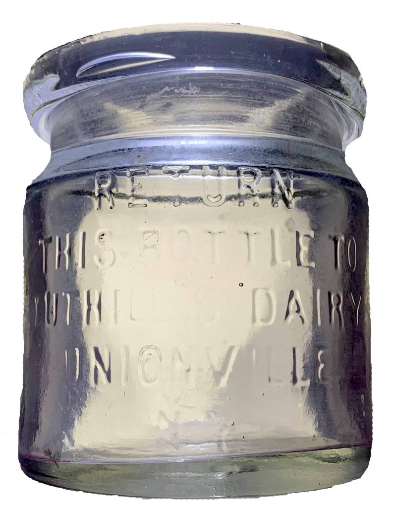 The Tuthill Milk Jar of Unionville, NY, said to date from the early 1870s, is one of the earliest examples of a glass vessel designed to contain milk in the United States. It features a pontiled base and a ground lip.