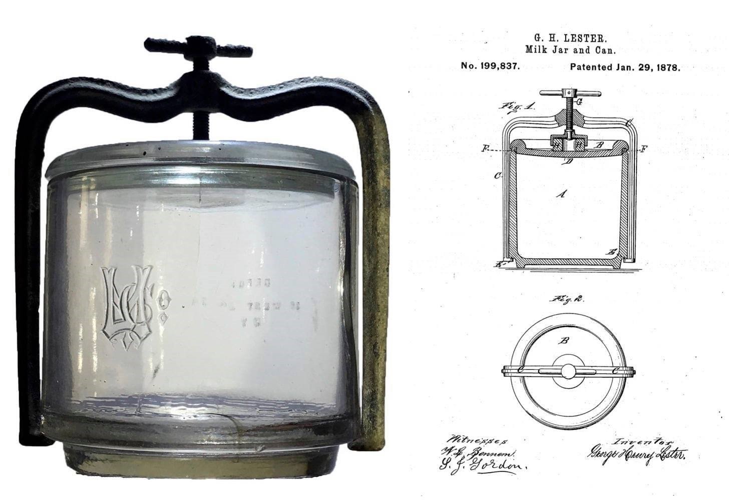 Patented in January of 1878, George Henry Lester’s milk jar was the first patented glass jar in the United States designed to hold milk. As with many of the era’s early glass jars, Lester designed his milk jar to combat the unsanitary measures of selling milk in cities during the nineteenth century. The jar’s lid was featured a glass lid held in place with a metal screw clamp.