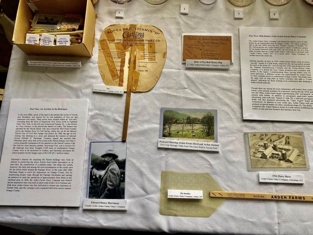 Started for the 2024 open house, rotating exhibits are now constructed for attendees. The debut of this exhibit showcased the milk bottles, and history, of the Arden Farm Dairy Company—founded by railroad titan Edward Henry Harriman at Arden, NY in the 1890s.