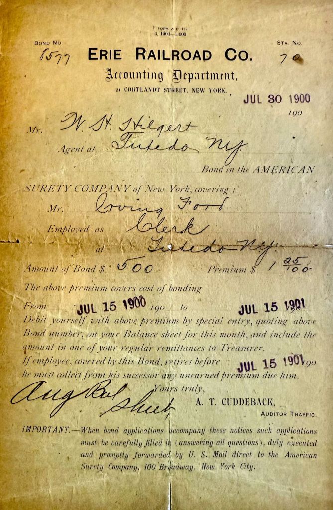A July 15, 1901 bond notice from the Erie Railroad accounting department between W. St. Hilgert, station agent at Tuxedo Park, NY, and Irving Ford, clerk at the Tuxedo Park station.