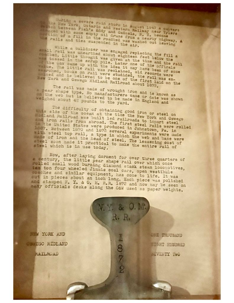 This small segment of rail was from the original New York & Oswego Midland Railroad, opened in 1872 between Weehawken and Oswego through Orange County. Uncovered near Cadosia, NY in Delaware County after storm-related damage in 1947, short sections of this rail were turned into paperweights for railroad officials and used for the next ten years until the railroad’s closure in 1957.