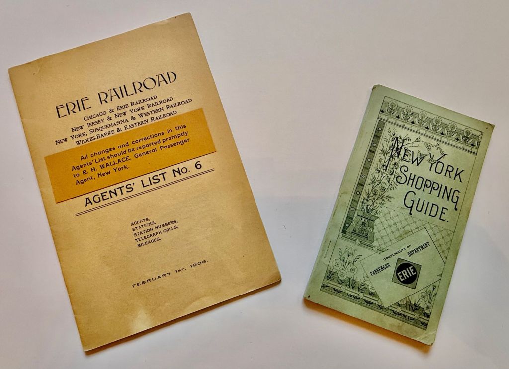 A list of agents along the Erie Railroad and an Erie Railroad shopping guide for New York City passengers, both C. 1900-1910.