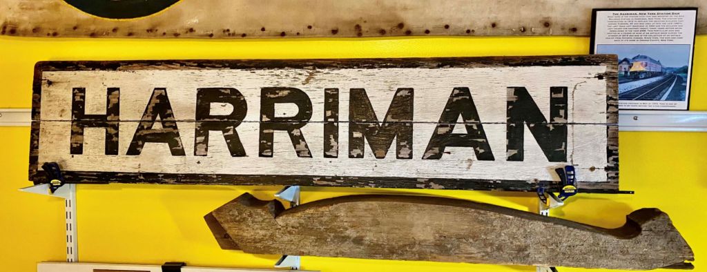 The Erie Railroad’s Harriman, NY station was designed shortly after the village’s name was changed from Turner’s to Harriman following E.H. Harriman’s passing in 1909. Opened in 1912, it stood dilapidated but largely intact until its demolition in 2006. Among the architectural details salvaged in the demolition were several of the wooden eaves, seen below the station sign. Vanished from the station since the 1970s, the sign traveled to an antiques dealer in Ontario before making its way back to Orange County.