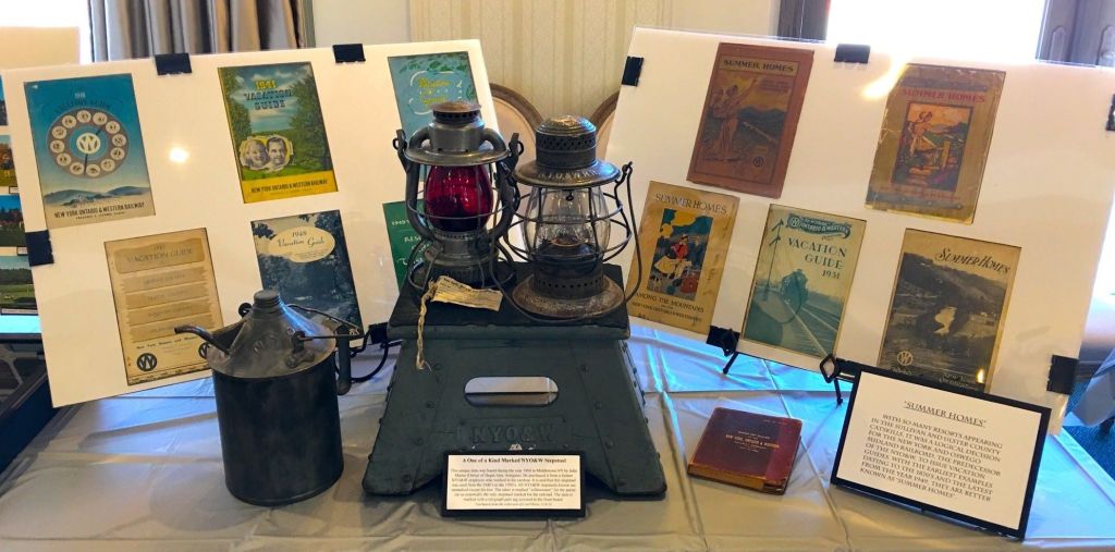 A display of artifacts from the New York, Ontario & Western Railway at a convention of the Ontario & Western Railway Historical Society. Prominently shown here are several editions of the “Summer Homes” vacation guides, issued from 1878 to 1949 for vacationers traveling from New York City to the Borscht Belt and other Catskill destinations. Though several years are still missing, this collection has one of the largest assortments of Summer Homes guides which are invaluable for research on the Borscht Belt era.