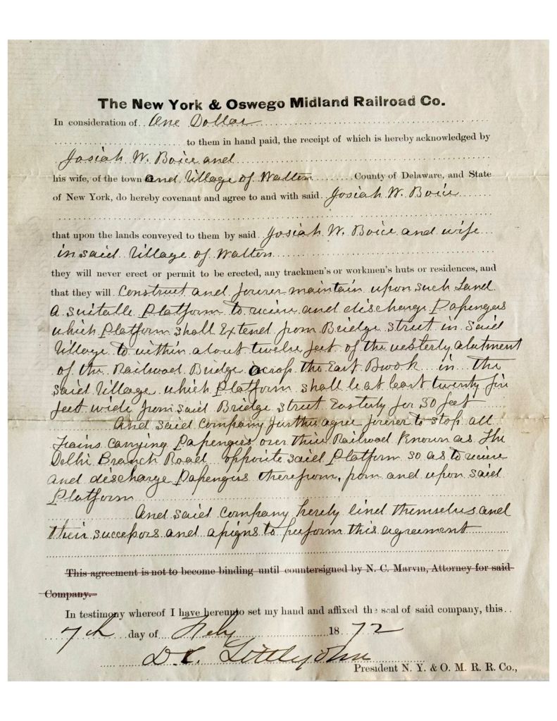 This C. 1872 agreement with Josiah M. Boice of Walton, NY to build a passenger platform on his property is signed by the president and founder of the New York & Oswego Midland Railroad: DeWitt C. Littlejohn.
