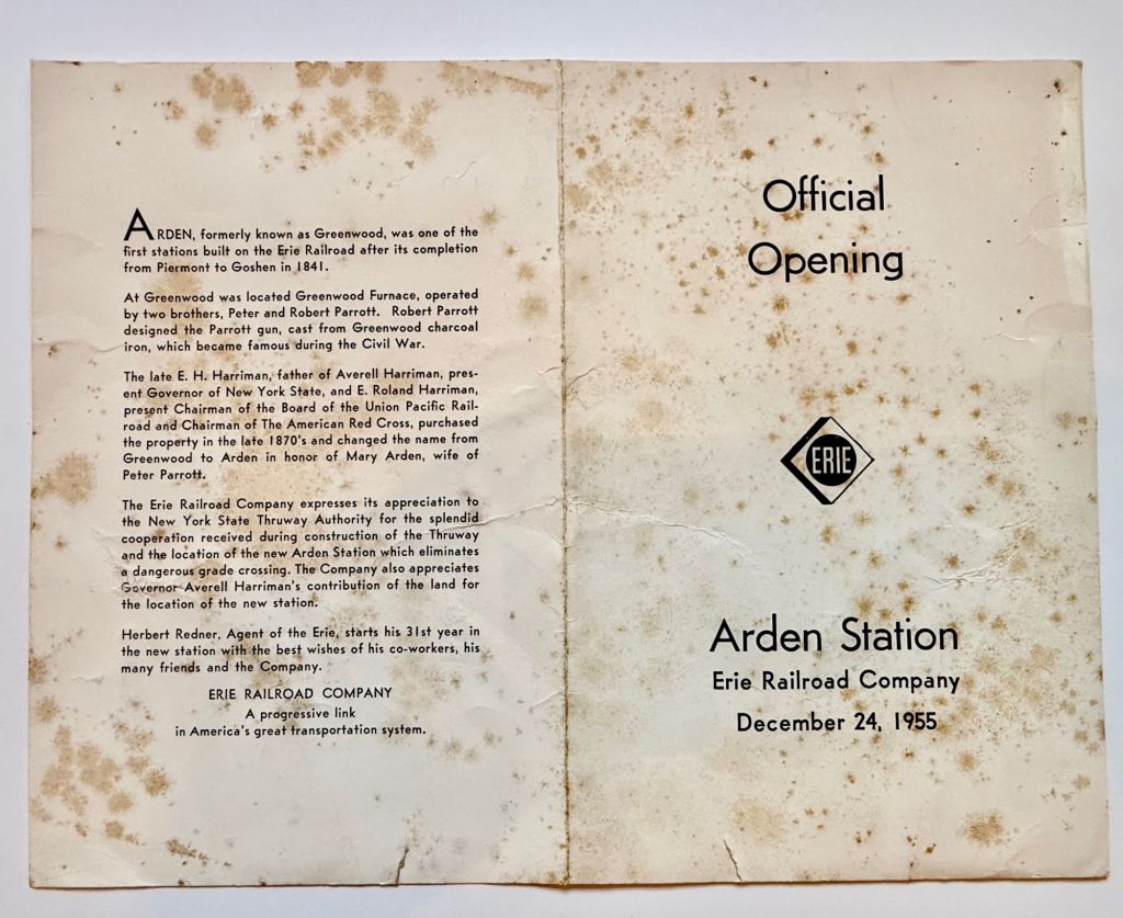 These promotional booklets were issued when the Erie Railroad’s new station in Arden, NY was opened in 1955 following the construction of the New York State Thruway.