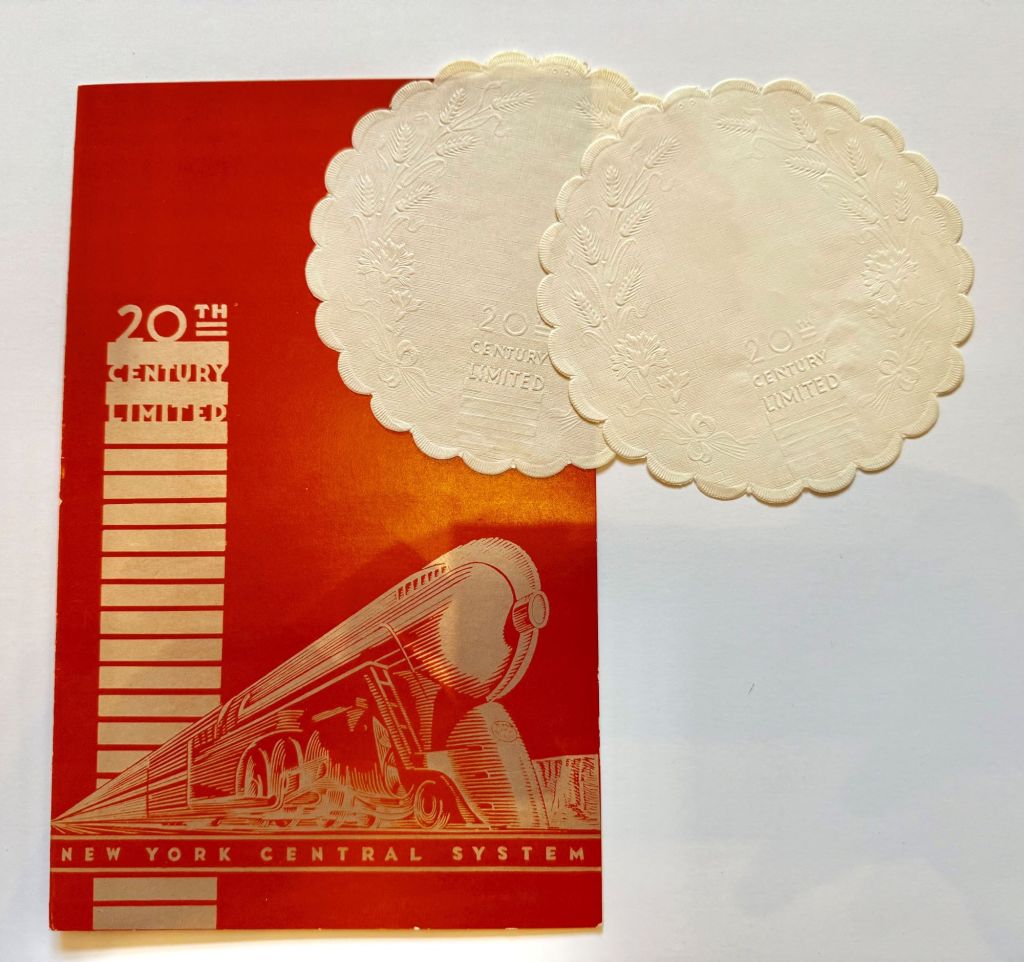 An original menu, along with paper doilies, from the New York Central Railroad’s famed 20th Century Limited.