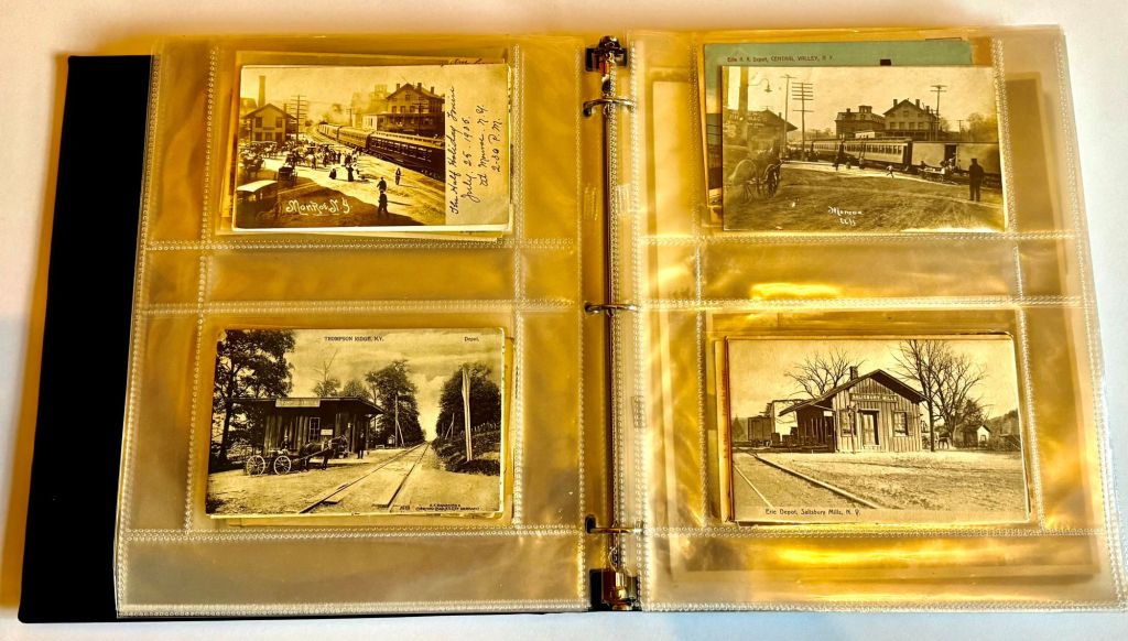 Several binders contain organized collections of postcards and images of railroad stations and related perspectives around Orange County.